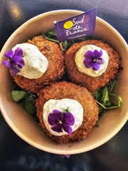 3 arancinis au cœur crémeux de truffe noire, riz igp de Camargue, panés à la chapelure panko, mayonnaise maison au céleri rave fumé, roquette assaisonnée, fleurs comestibles